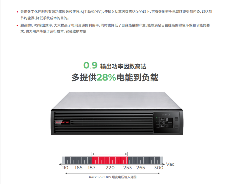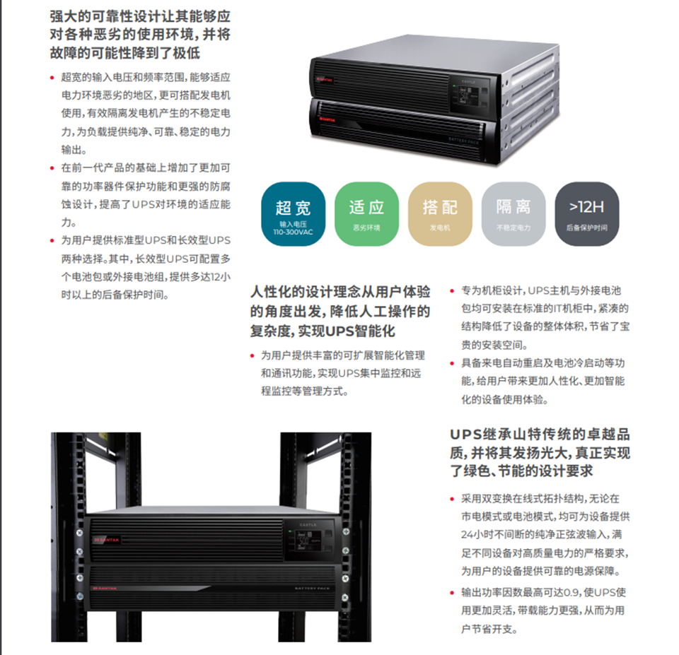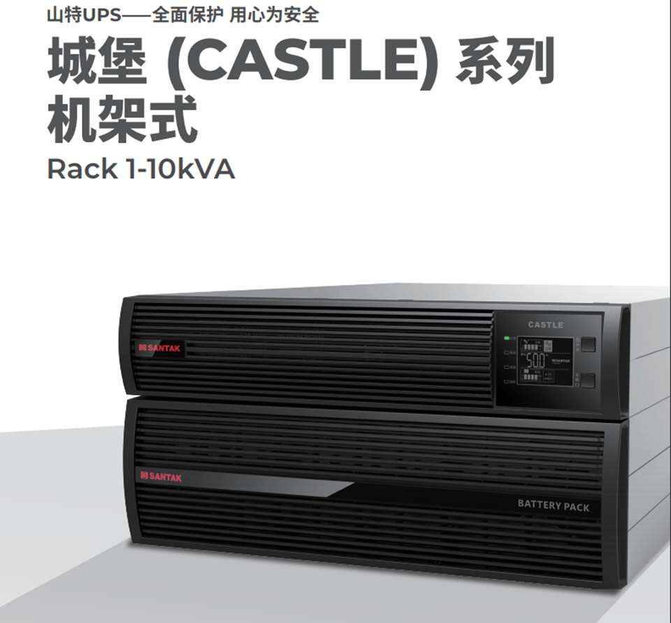 山特UPS全面保護,用心為安全,城堡(CASTLE)系列機架式Rack1-10KVA,城堡機架式系列,新款產品在輸入輸出各項性能及功能上進行了提升,能更有效匹配用戶的設備,提高能源使用效率以及降低應用成本。