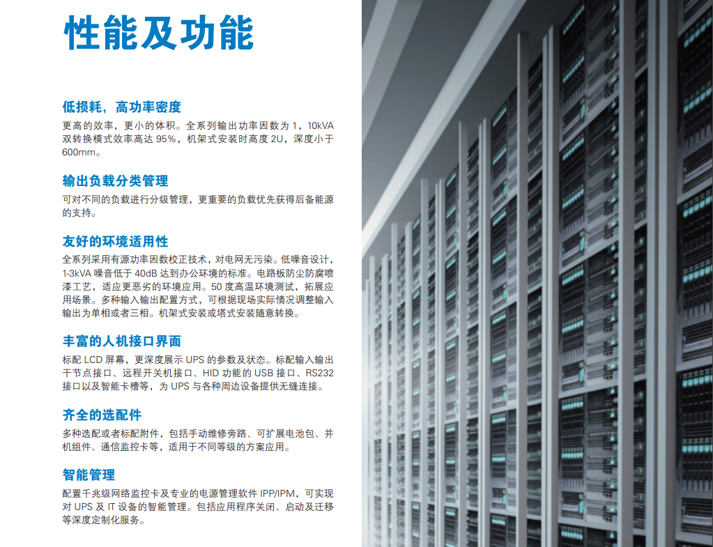 產(chǎn)品特點(diǎn):低損耗,高功率密度,輸出負(fù)載分類管理,豐富的人機(jī)接口界面,齊全的選配件。